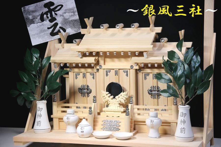 - 三社■屋根違い■■銀風三社■■神棚セット 神具 棚板付き 限定