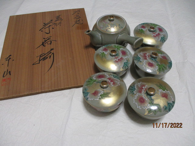 - 九谷 煎茶器揃 東山 共箱 未使用 金彩 花図(20221117)
