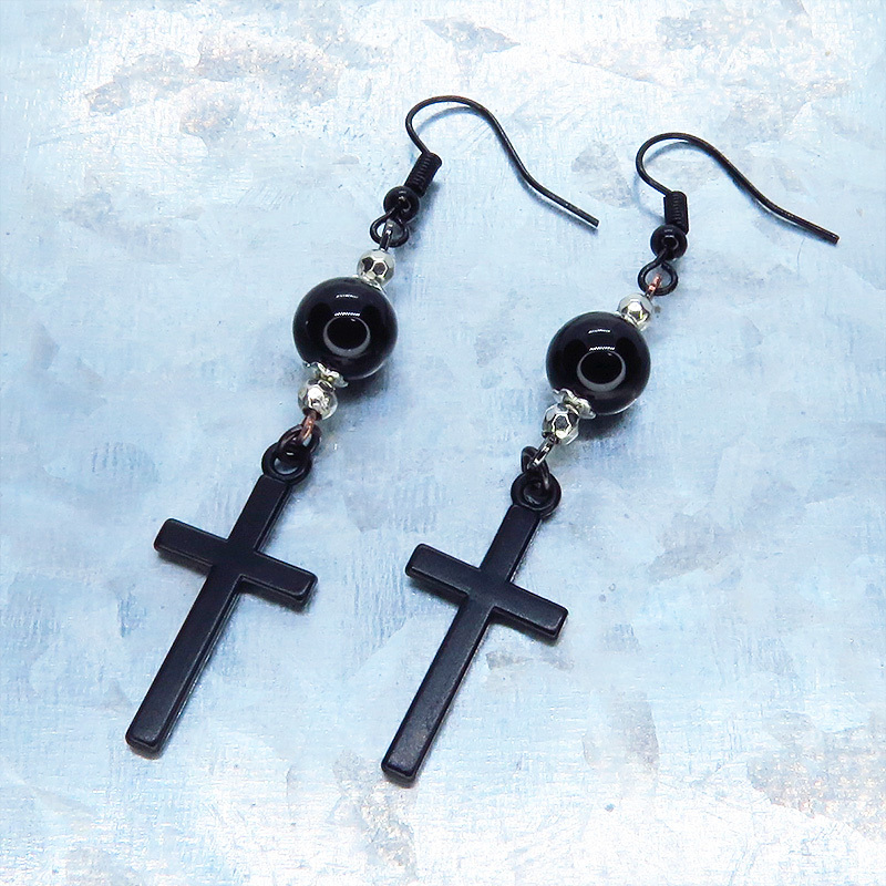 - 黒いロザリオ(十字架・クロス)とオニキスを組合せたブラックピアス アクセサリー メンズ レディース