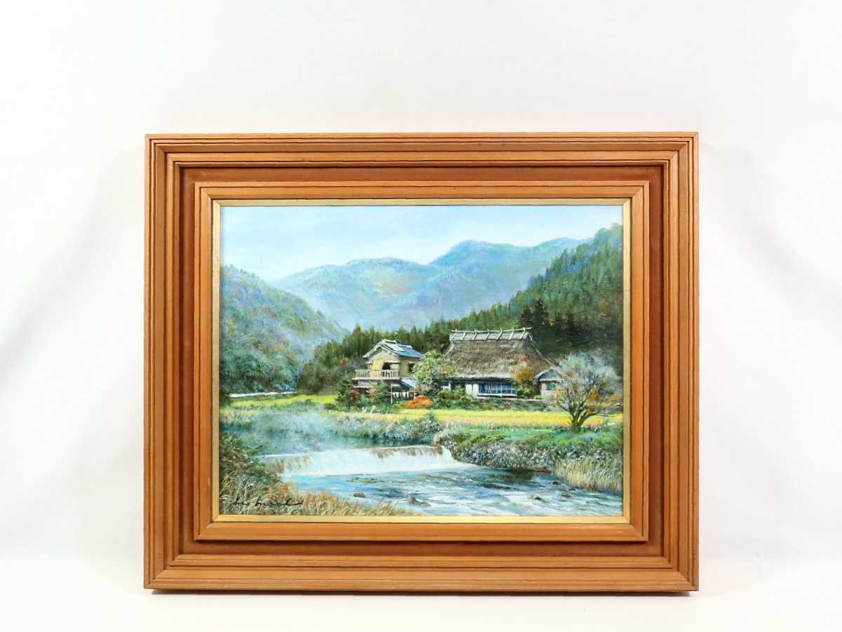 > 真作 森誠 油彩「清流と旧家」画寸 P10 長崎県出身 新槐樹社会員 赤松麟作に師事 山間の古民家と田畑、傍を流れる渓流を写実的に描く 6862