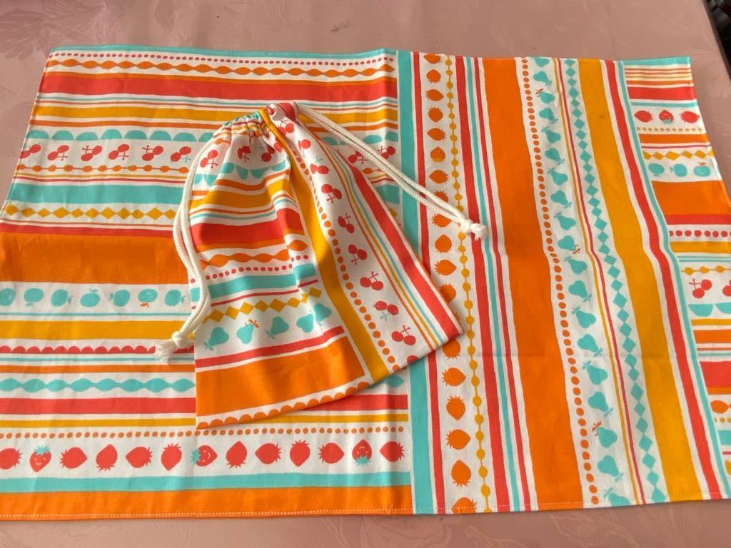 - No.159 大判裏付ランチョンマット&巾着 ハンドメイド 40x60 オレンジフルーツ柄