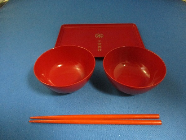 - ★宇部神社 盆・箸・器セット 汚れキズ等あり 器*径9㎝ 高さ4.5㎝ 盆*13.5×19㎝ tm2301-9-7★