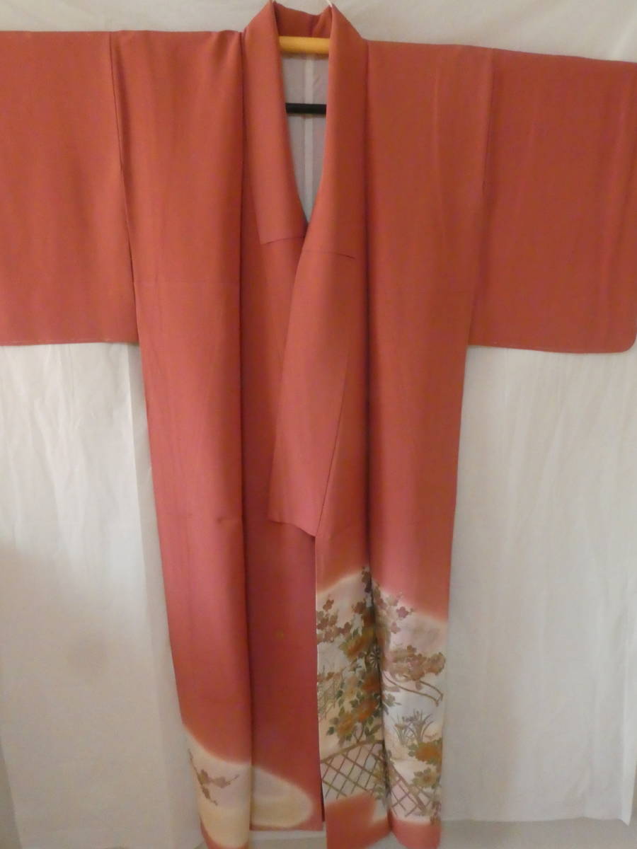 - ⑬美品 和装 着物 色留袖 三つ紋 身丈約152.5㎝ 花 くすみピンク 赤ピンク系 落款 作家 丸に二つ引き 準礼装 慶事 結婚式
