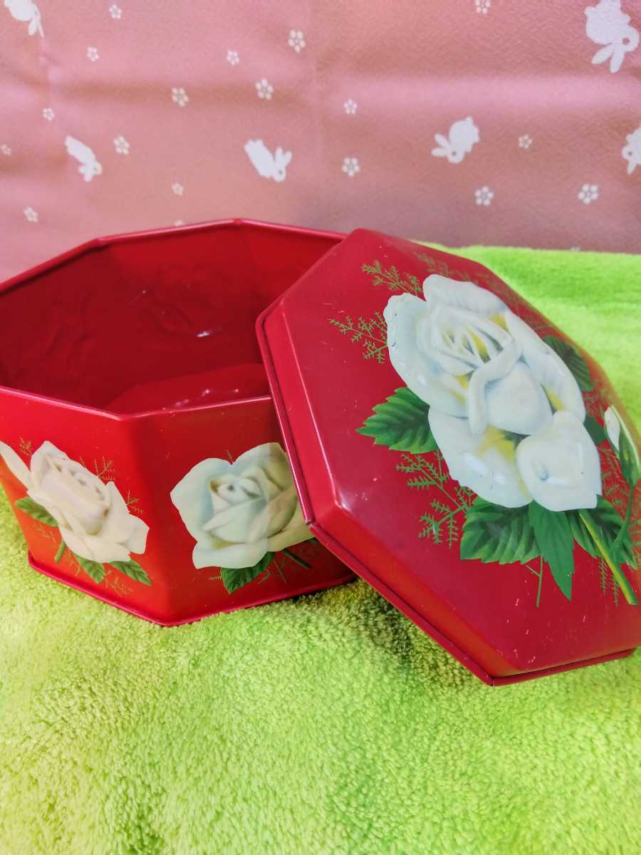 - ブリキ缶 バラ 8角形缶 薔薇 八角形缶 昭和レトロ缶 アンティーク缶 コレクション 小物入れ 赤色缶 薔薇缶 小物入れ