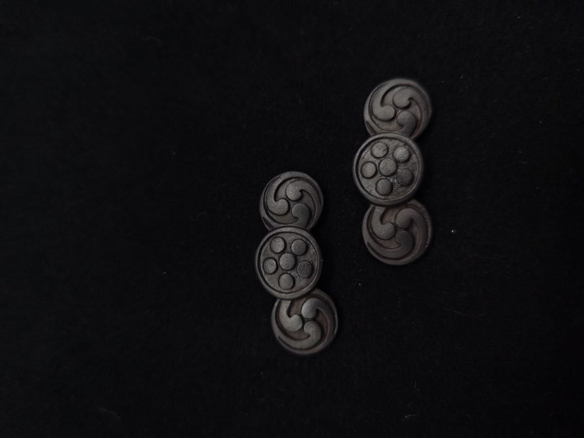 - s-008 三巴紋目貫 容彫 日本刀 武具 刀装具 銅製 小道具 鍔 目貫 縁頭 拵 長 3.82CM