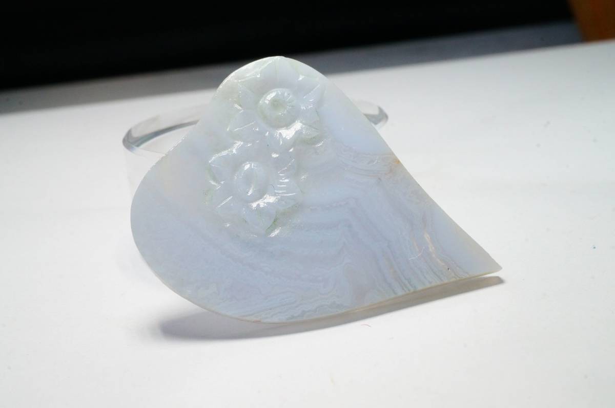 - 【即決特別価格!早い者勝ち】希少30年前の原石を加工彫刻!極上天然ブルーレースアゲート(青縞瑪瑙)「花」彫刻研磨高透明度ルース16ct