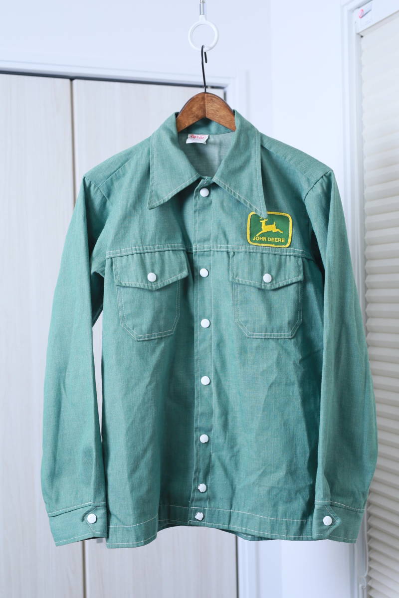- ★ヴィンテージ Cap'n Jac ワッペン付き長袖デニムジャケット 古着ユーズド男性メンズS緑グリーンシャツ海外国トップス上着