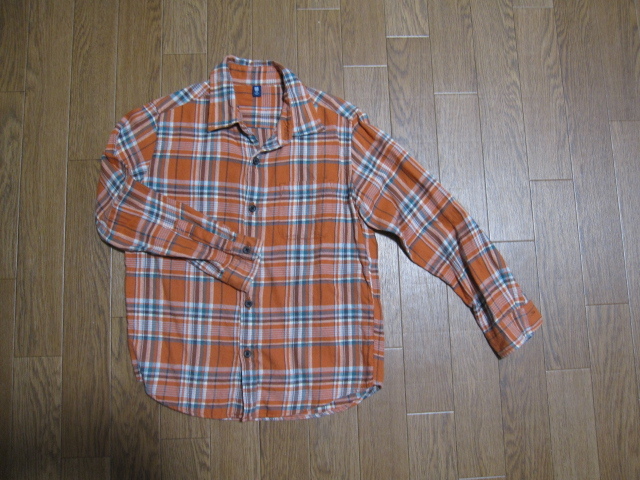 > 【送料無料】長袖シャツ UNIQLO オレンジチェック柄ネルシャツ 130 USED美品