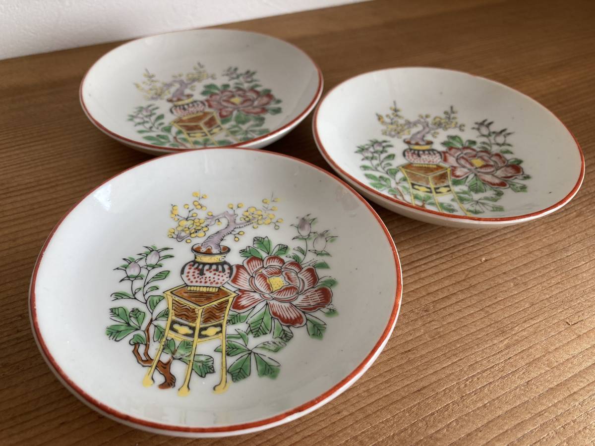 - 統制陶器 昭和初期 アンティーク 小皿 牡丹 梅 花柄 和食器 3皿セット