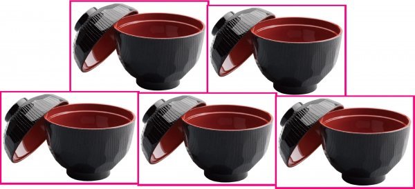 - 【送料無料:お椀:5個:日本製】★山中塗り:ふた付 亀甲 吸物椀 「黒系:内朱色」5客★食器洗浄乾燥機 対応:No25d:1837:D 漆器 椀 小丼