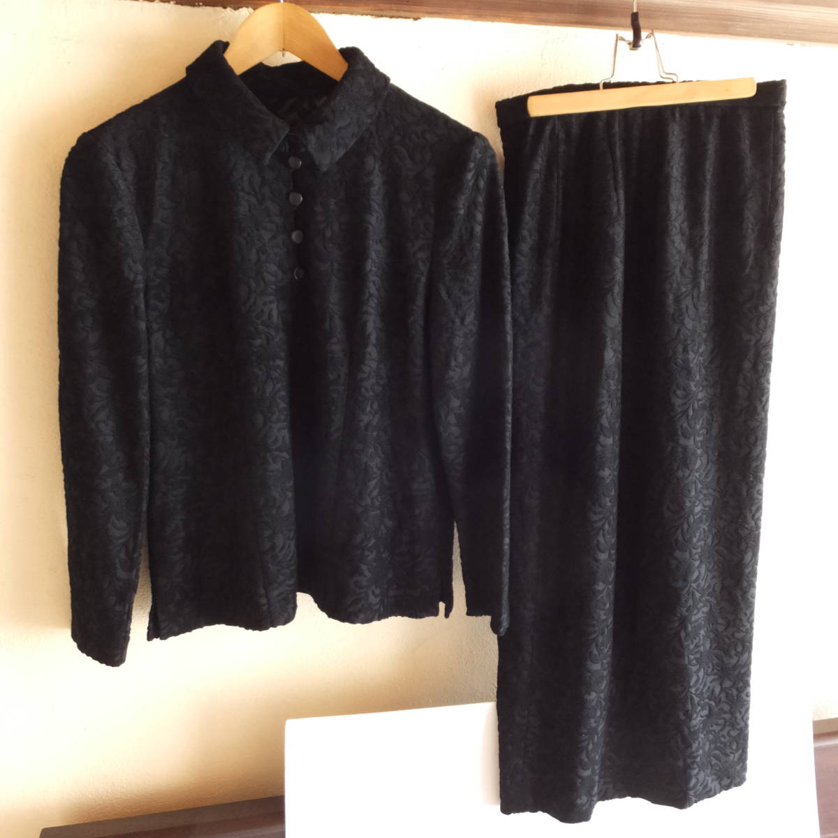 > Leilian レリアン セットアップ ブラウス+スカート 黒 ブラック 総柄 凸凹 エンボス素材 透け感素材 ドレス