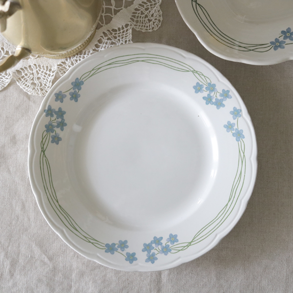 - 『サルグミンヌ 勿忘草 青いお花』フランスアンティーク 花柄 皿 リム カフェ D アールヌーボー 植物 わすれな草 スカラップ Sarreguemines