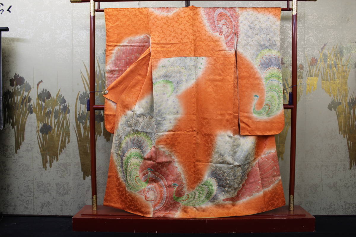 - きもの今昔5123 振り袖 正絹五枚繻子地 舞鶴地文様黄丹(おうに)色 孔雀の柄 袖丈92cm 身丈153cm