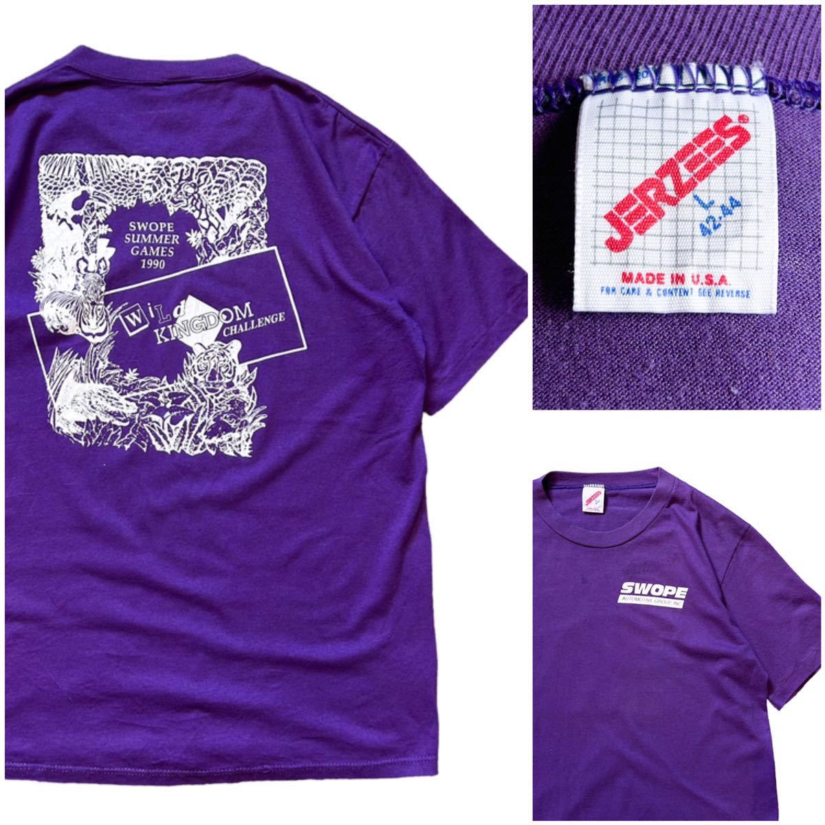> USA製 90’s JERZEES ジャージーズ ヴィンテージ Tシャツ Lサイズ パープル 紫 アニマル トラ シマウマ キリン ワニ 動物 バックプリント