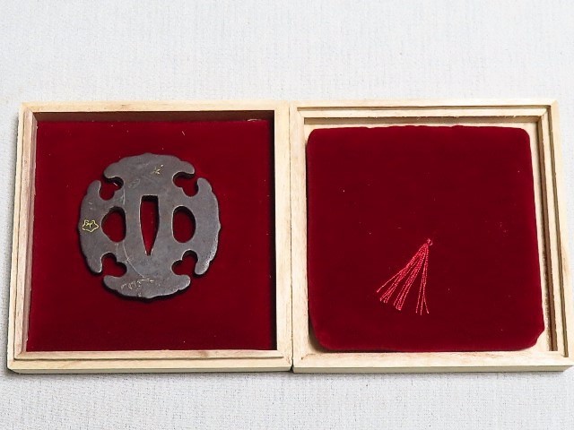 - 鍔 鉄地刀鍔 象嵌 彫金細工 金工細工 刀装具 桐箱