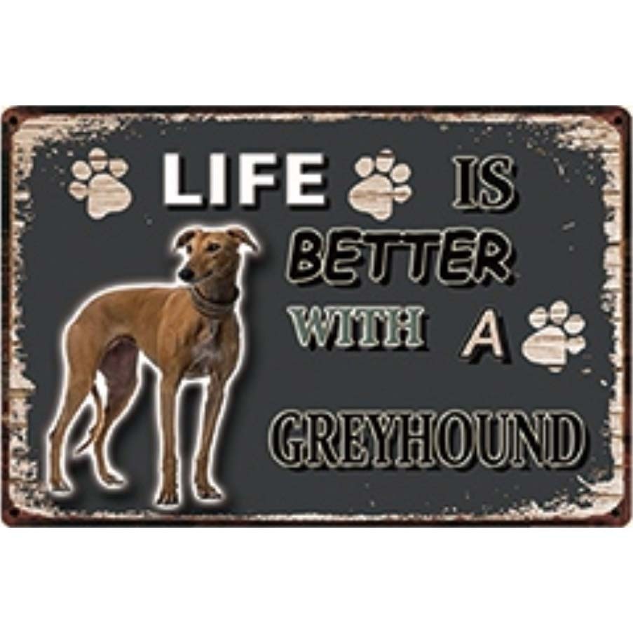 > A3173 メタル サイン ブリキ 看板 金属 プレート パネル 注意 動物 ペット 犬 番犬 LIFE IS グレー グレイ ハウンド【3956