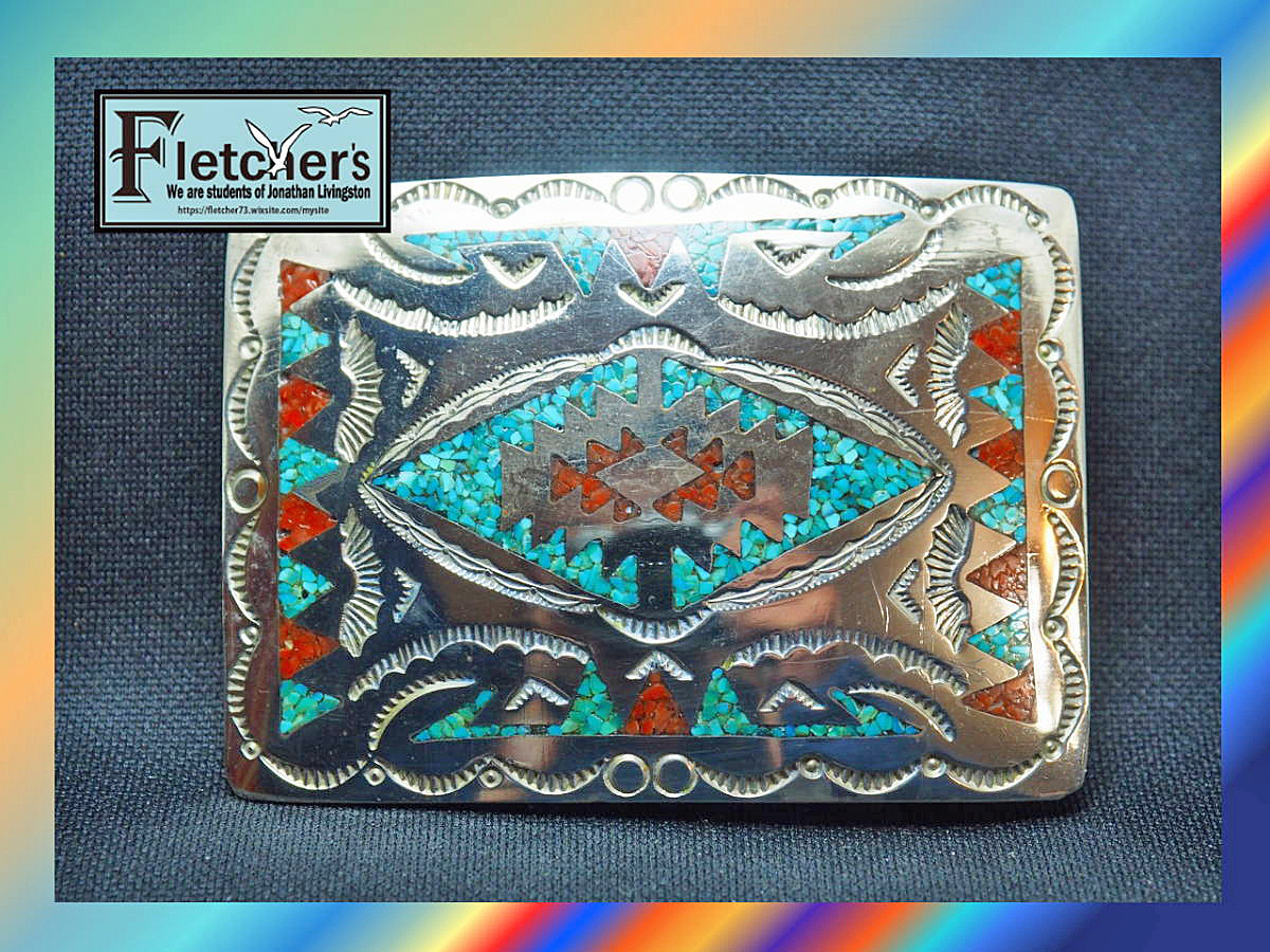 - +インディアンジュエリー ナバホ族作家作 シルバー ターコイズ コーラルバックル ネイティブアクセサリーe79