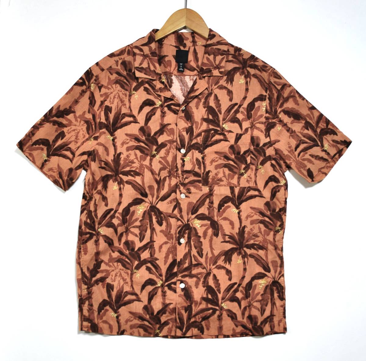 - 即決【H&M】エイチアンドエム ヤシの木 総柄シャツ 麻混 茶 S 新古