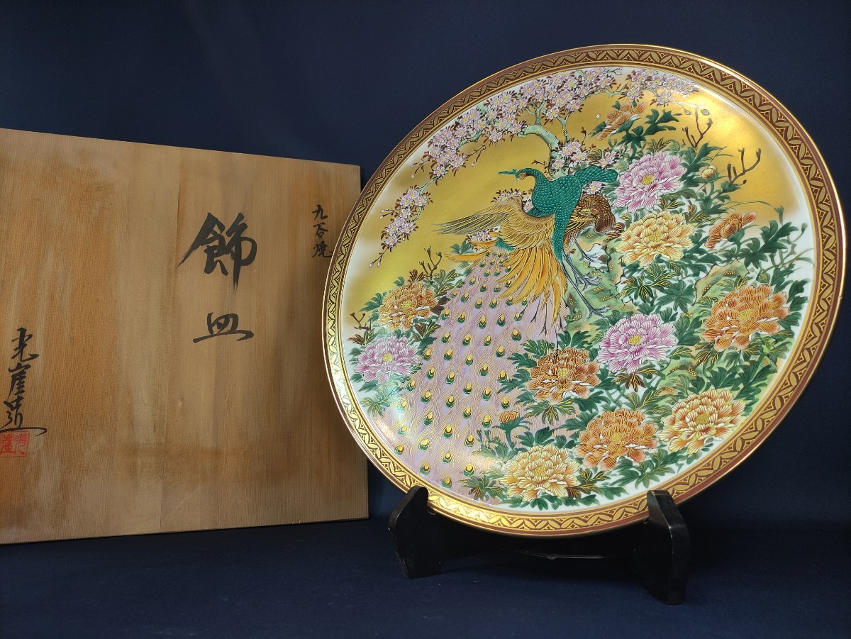 > r43 九谷焼 【光崖】金彩花鳥図色絵大皿 孔雀に牡丹 飾り皿 飾皿 径約40cm 古美術 骨董 時代物