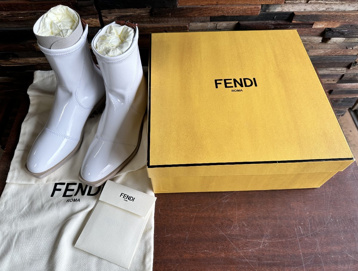 - 新品 Fendi バックジップ パテント ショート ブーツ ホワイト スクエアトゥ 35