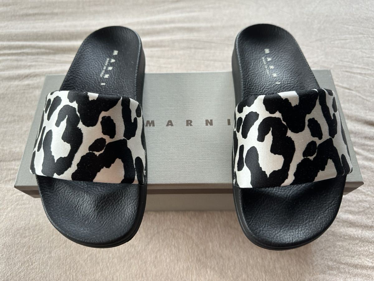 > 37新品 MARNI レディース レオパード サテン サンダル シューズ 21SS size 37 23.5cm マルニ ブラック ホワイト