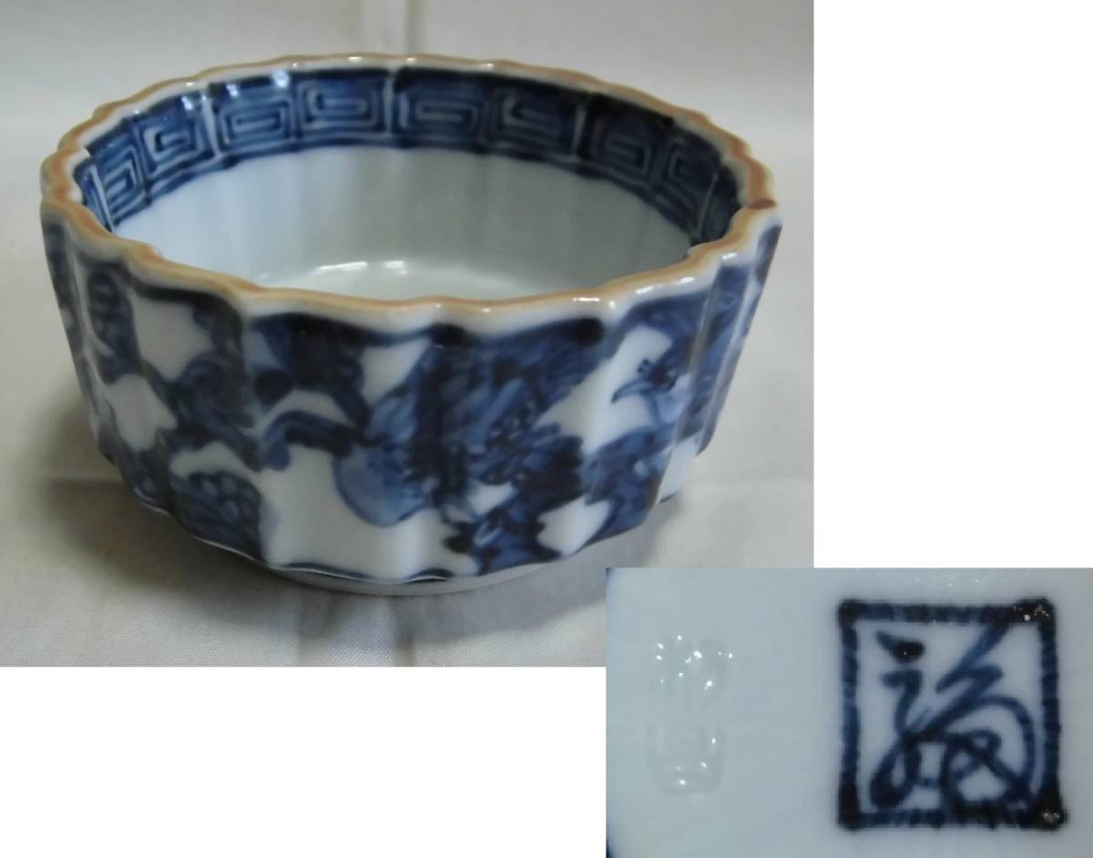 - 古い 小鉢 渦福 角福 染付 花鳥柄 陶器 工芸品 食器 レトロ アンティーク