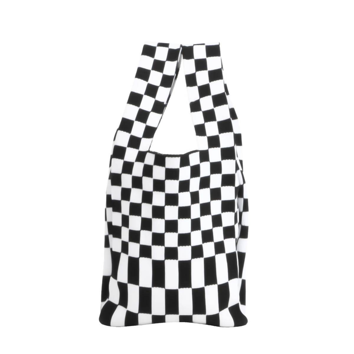 - ニットバッグ トートバッグ ホワイト×ブラック トート ブロックチェック 少し大きめ エコバッグ トートバッグ