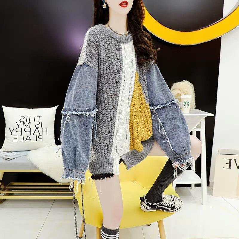 - 【 グレー &イエロー★XL】 デニム セーターゆったり 可愛い 丸首