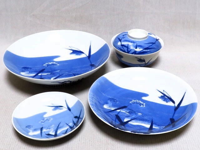- 蓋付茶碗 皿まとめて4点 丸皿 葦に鴨図 染付 鍋島