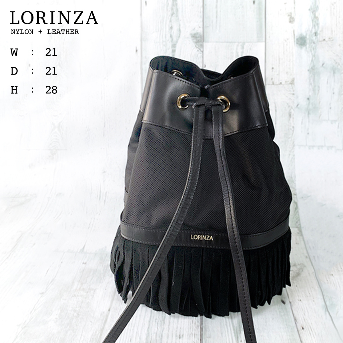 - LORINZA ショルダー 別売 ナイロン 本革 レザー 巾着 バッグ 黒 ブラック 円形 ラウンド フリンジ カジュアル ロリンザ メンズ レディース