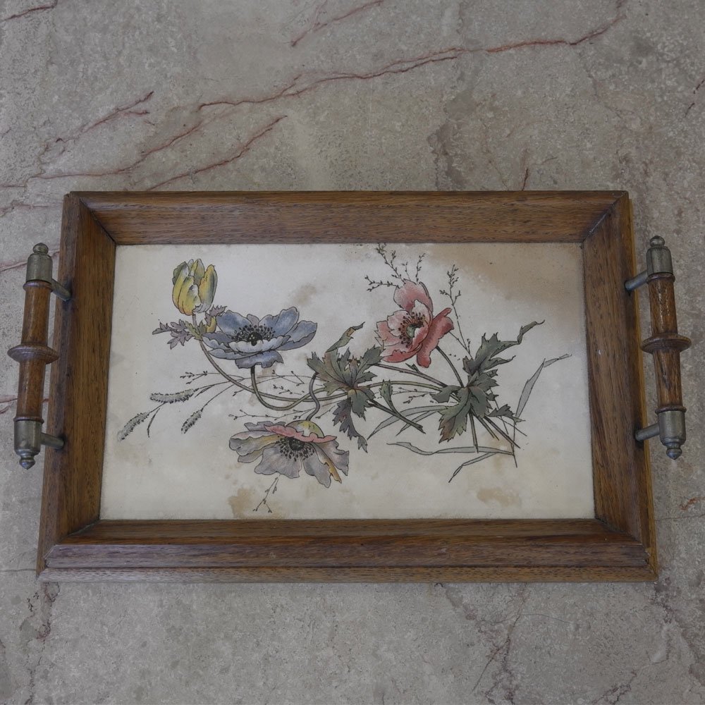 - 【”気分”華やぐ優美な時代のトレイ】V&B M陶板陶器ハンドル付き木製枠花フラワー文様19世紀アールヌーボー インテリア パリフランス 雑貨