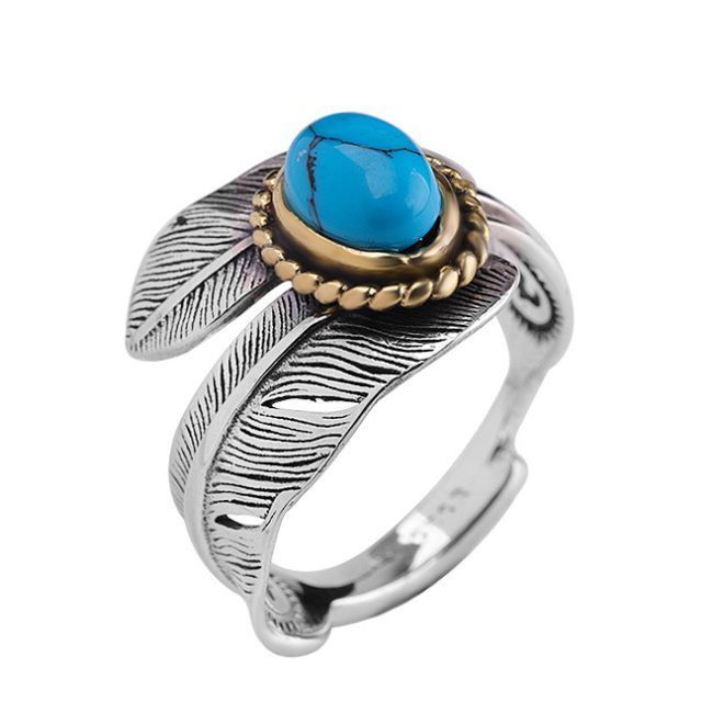 - フリーサイズ フェザーリング 大粒 ターコイズ ストーン 羽 指輪 13号~22号