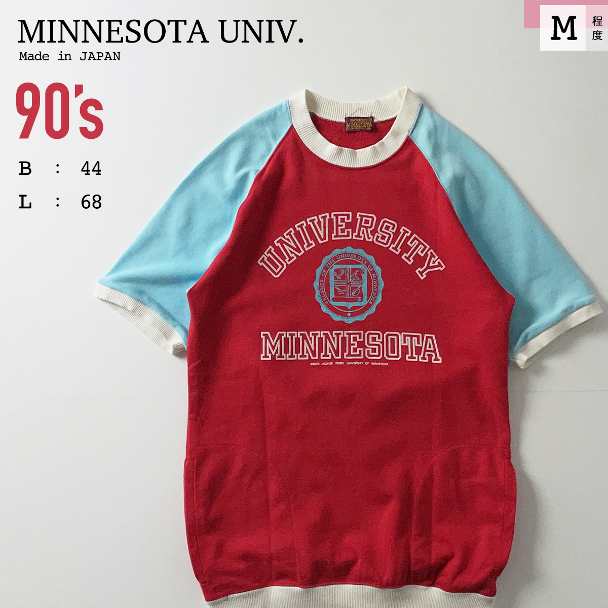 > 90s ロング丈 厚手 カレッジ ロゴ プリント 半袖 スウェット Tシャツ 赤 レッド ラグラン アメカジ 夏 リブ ヴィンテージ レディース M 9号