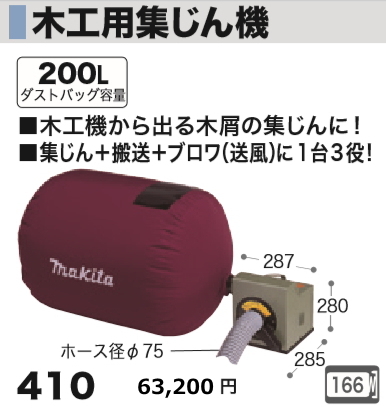 マキタ 木工用集塵機 410 定価63,200円(税別) ■木工機から出る木屑の集じんに ■集じん+搬送+ブロワ(送風)に1台3役 ■主要機能 集じん容量200L 電源単相100v 電流11A 消費電力 1050w本機寸法(長さx幅x高さmm)=285 x 287 x 280、質量9.3kg コード5m ■付属品 ホースコンプリート(2.5m/口元取付金具付) ダストバック