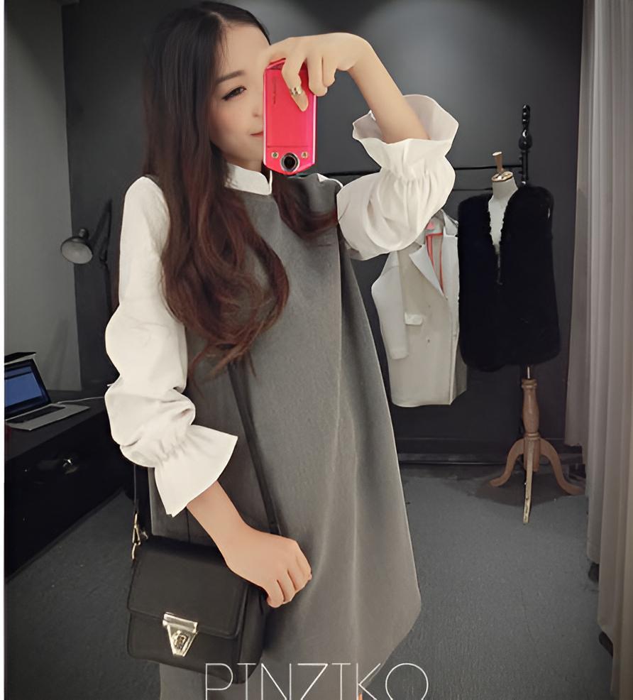 - 新8.シャツ ワンピ 清楚 重ね着風 ゆったりAライン 無地 グレー M