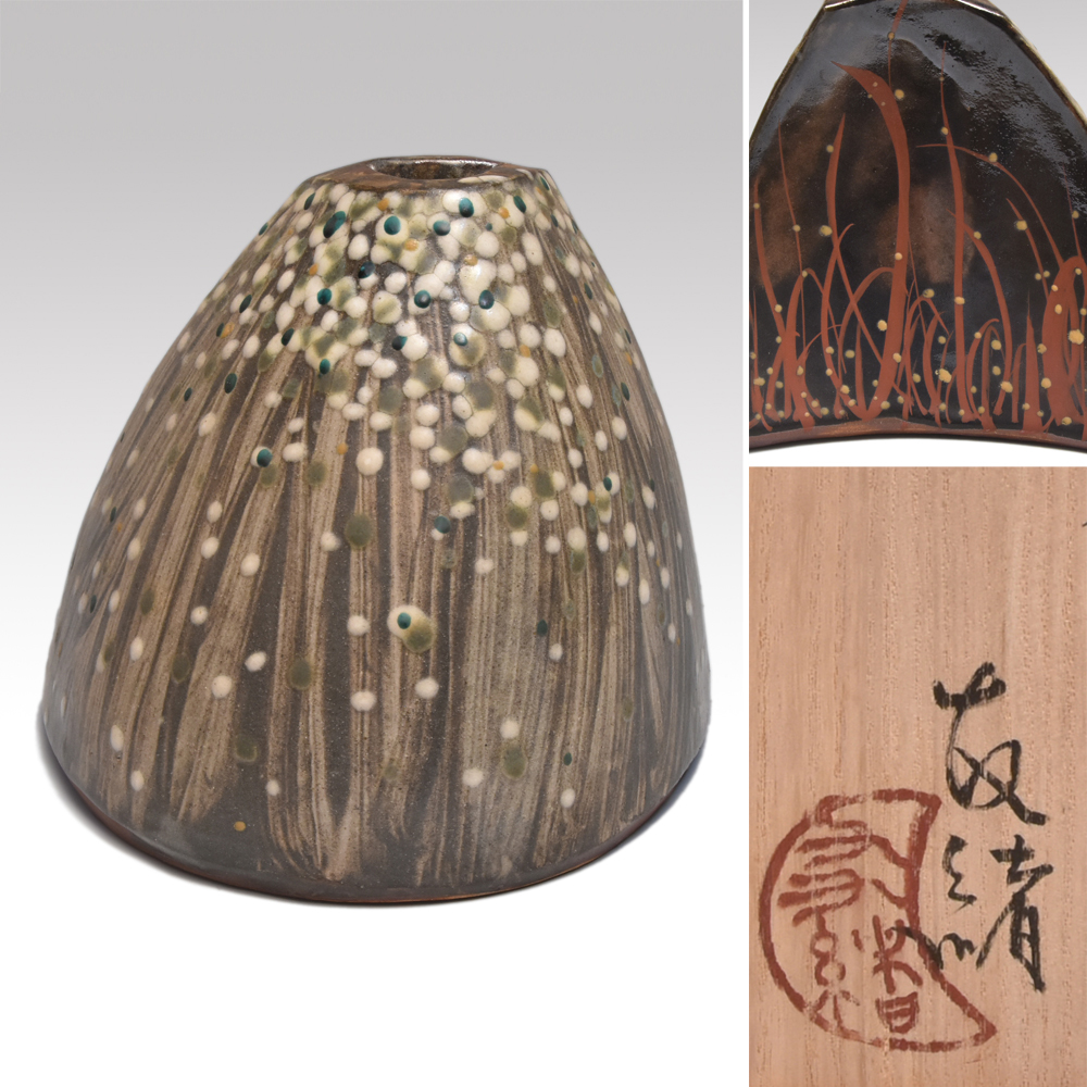 > 浜田友緒(造)刷毛目黒掛二彩赤絵文打月形扁壷 共箱 人間国宝 浜田庄司の孫 現代工芸 美品 益子焼 y2428