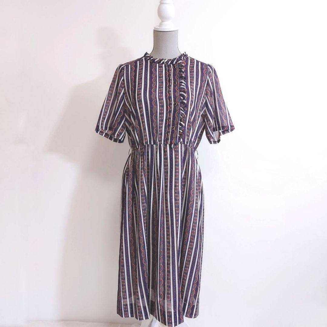 > レトロ古着 エスニック総柄 ロング丈ワンピース フリル使い半袖 ペイズリー 13号 XL 青&赤&緑&白&ブラウン66392