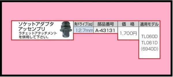 ![マキタ ソケットアダプタアッセンブリ A-43131 [TL060D/TL061D]■安心のマキタ純正/新品/未使用■拍卖](http://yahooimg2.ymibuy.cn/i/auctions.c.yimg.jp/images.auctions.yahoo.co.jp/image/dr000/auc0410/users/24d8ca46ba16483b7745d2d2584e620fc7545fb1/i-img600x269-1698334096ae5vxw1597297.jpg)