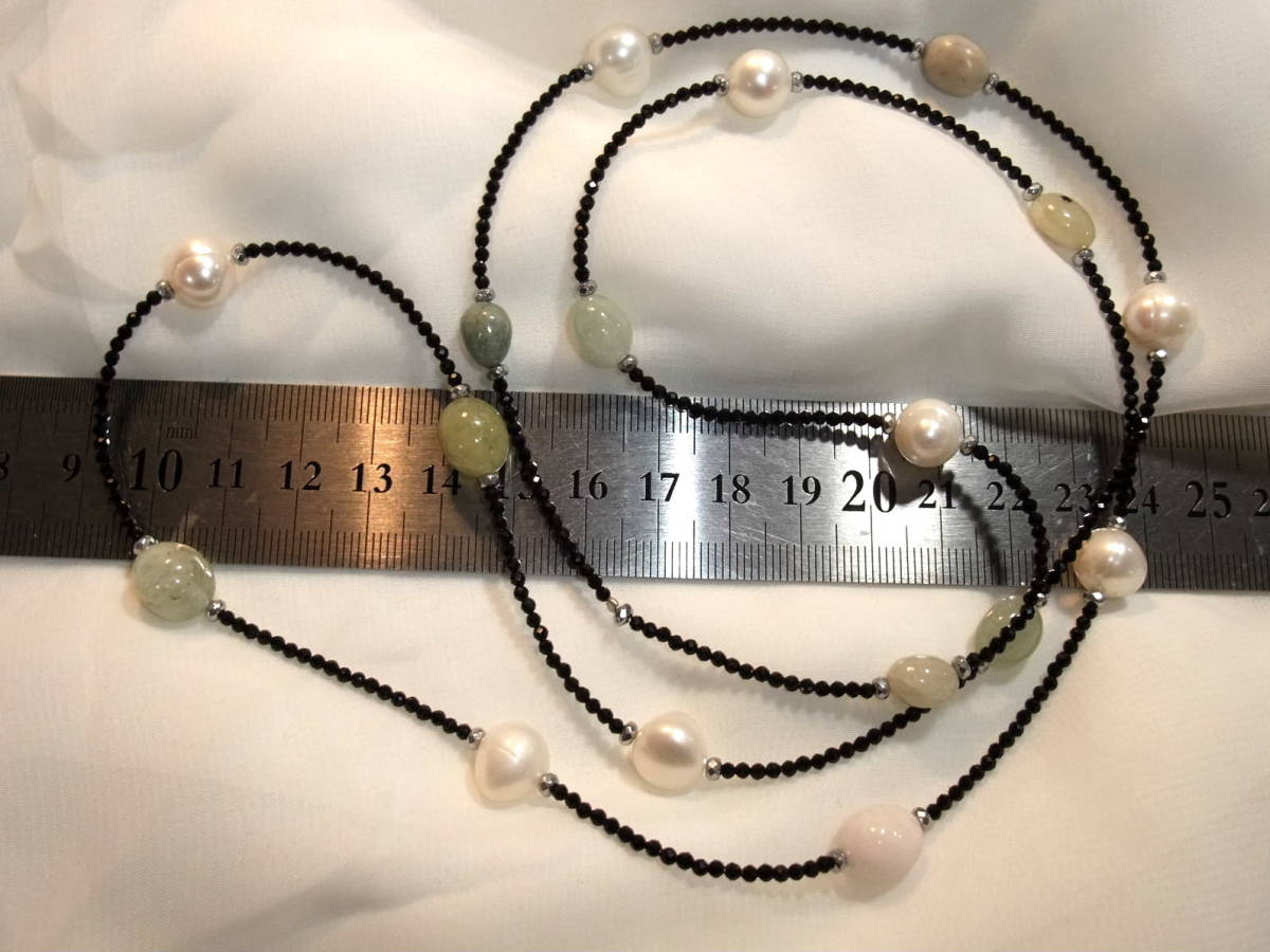 - 144-3 ブラックスピネルアクアマリンモルガナイト90㎝ロング金具なし淡水真珠等のネックレス!天然石その他使用