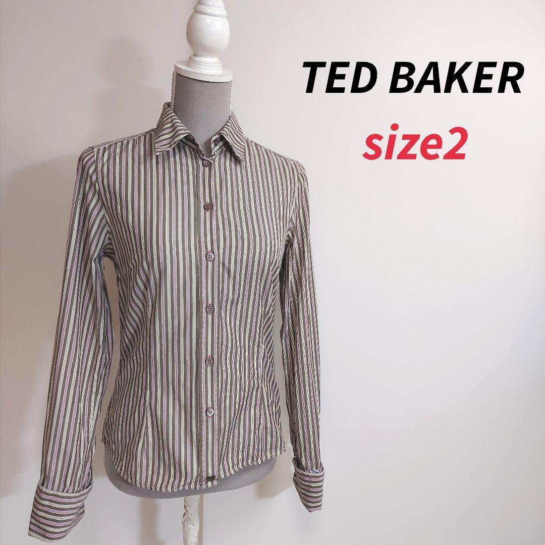 - TED BAKER マルチストライプ長袖ブラウス・ジュエリー調カフスボタン 表記サイズ2 M カーキグレー&薄紫ライトパープル&白&ライトベージュ