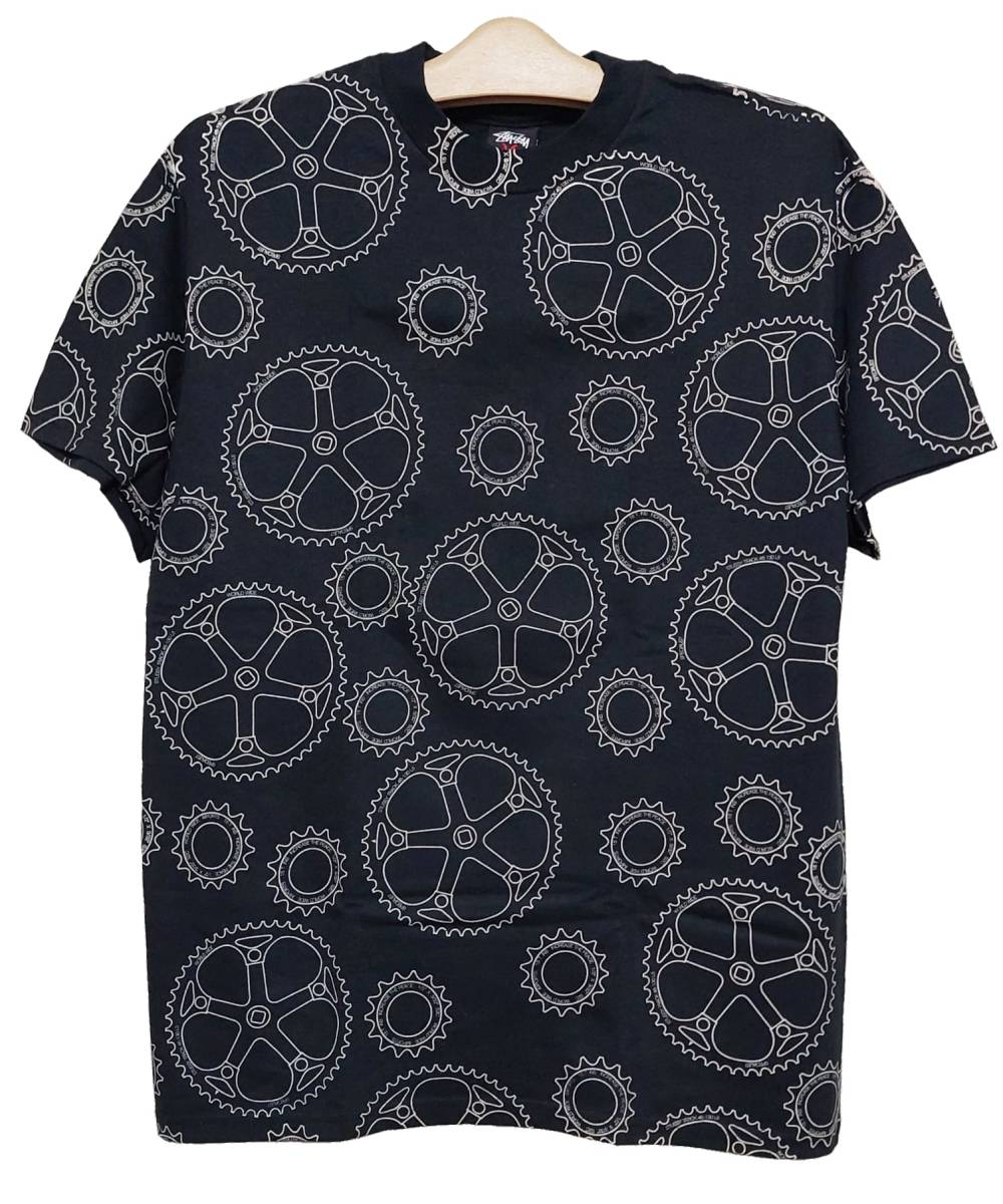 > 超爆レア希少!新品タグ付き!STUSSY ステューシー×FIXED/ロゴ英数字&ギア総柄コラボ限定Tシャツ M ブラック デッドストック/入手困難