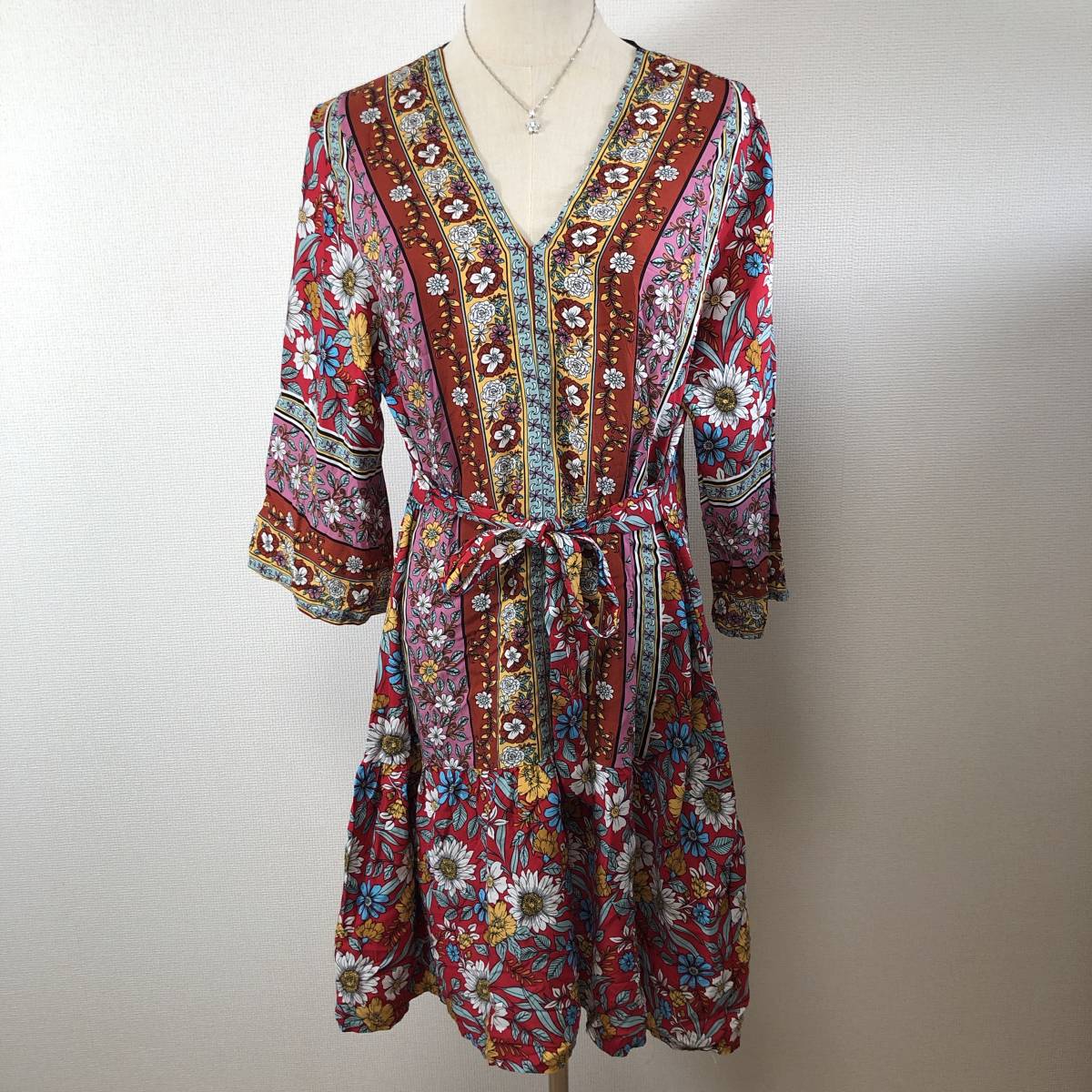 - WS0364 レア レディース ひざ丈ワンピース ハンドメイド かわいい レッド(赤) 花柄 華やか キュート フラワープリント ウエストリボン