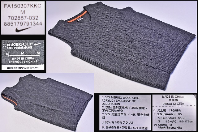 - NIKE GOLF ★ ナイキ ゴルフ ★ ベスト ★ M ★ チャコールグレー ★ FA150307KKC ★ 羊毛55% アクリル45% ★ ジャンク品 腹部に穴あります