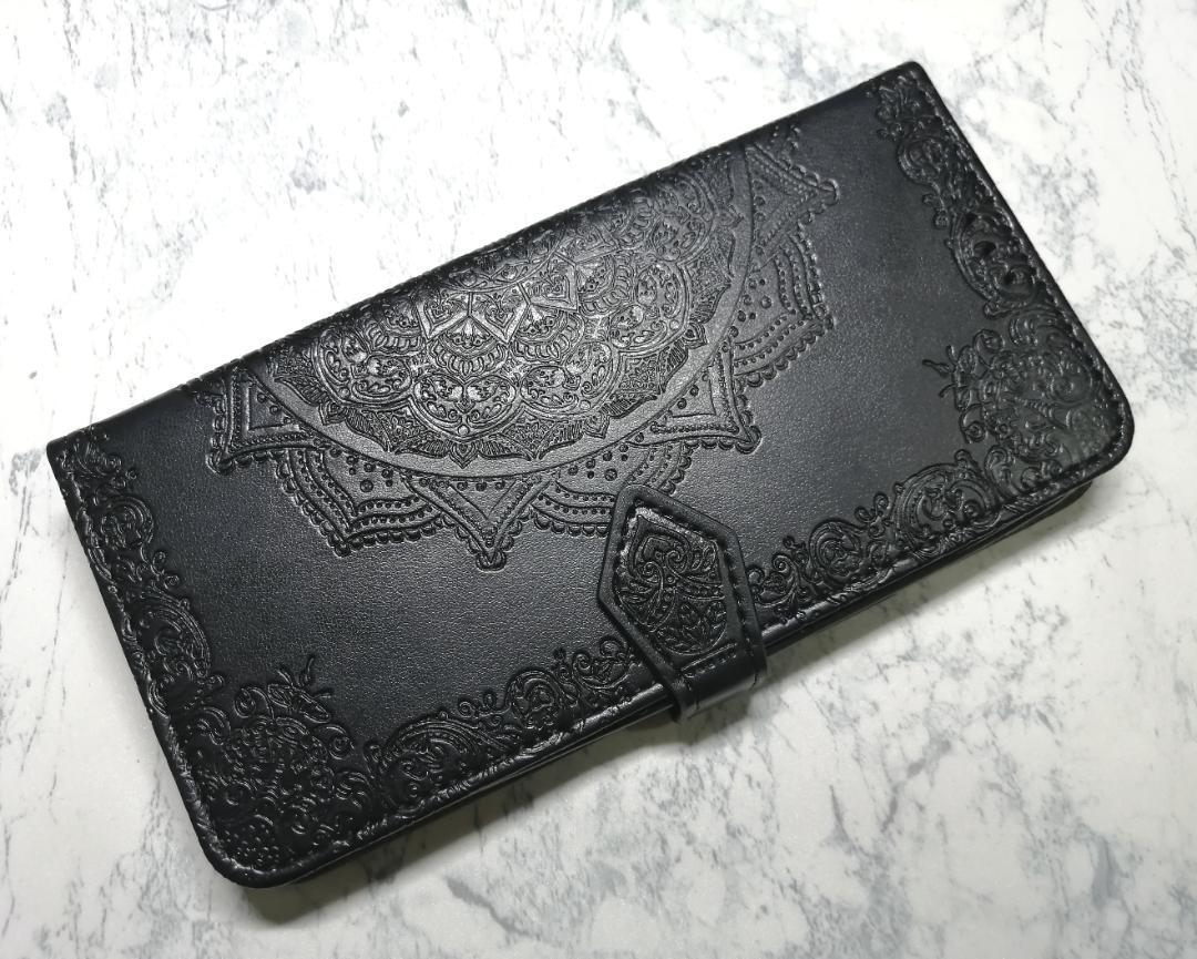 - 小しわ 手帳型 iPhone14Plus 用 ケース 浮彫曼荼羅 ブラック 黒色