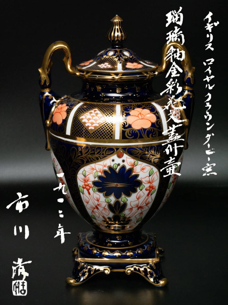 > 【値下げ交渉有り】アンティーク ロイヤルクラウンダービー オールドイマリ 瑠璃金彩花紋蓋壺 飾壺 西洋骨董鑑定家市川清氏箱書 識箱付