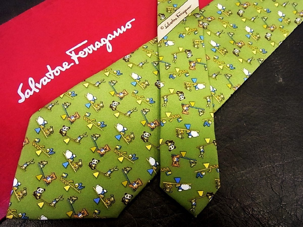 > ♪vr0548♪良品♪【Ferragamo】フェラガモ【くま パンダ 兎 ネズミ ペリカン 羊 動物 シーソー 柄】ネクタイ
