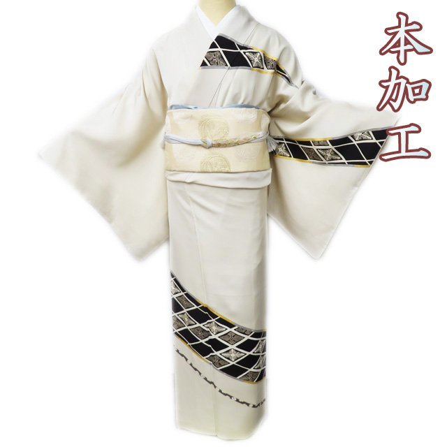 > 特選 訪問着 着物 中古 正絹 袷 フォーマル 本加工 菱文 松菱 利休白茶色 焦茶色 金 身丈166.5cm 裄72cm L トール きもの北條 A962-5