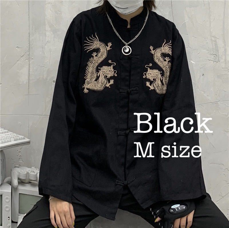 - シャツ ビッグシルエット 長袖 アウター チャイナシャツ トップス ユニセックス男女兼用 ブラック 黒 M