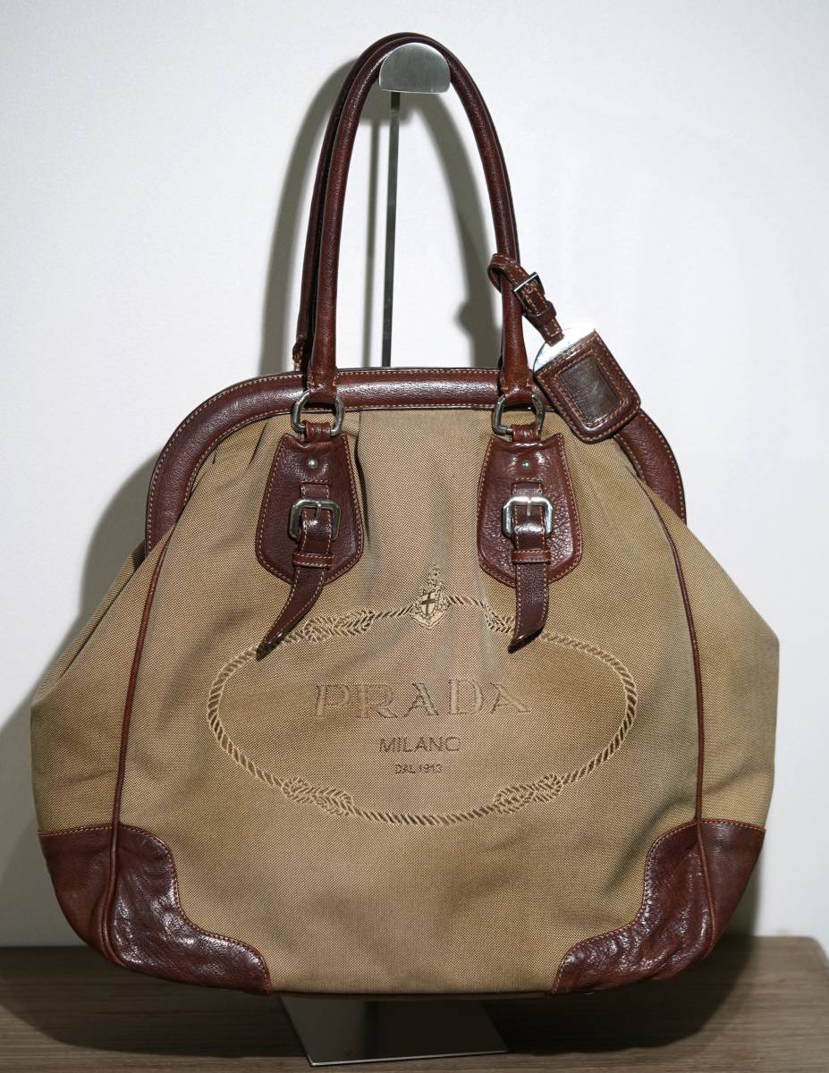 > 希少 PRADA プラダ ハンドバッグ がま口 三角ロゴプレート トートバッグ 肩掛け レディース バッグ キャンバス×レザー
