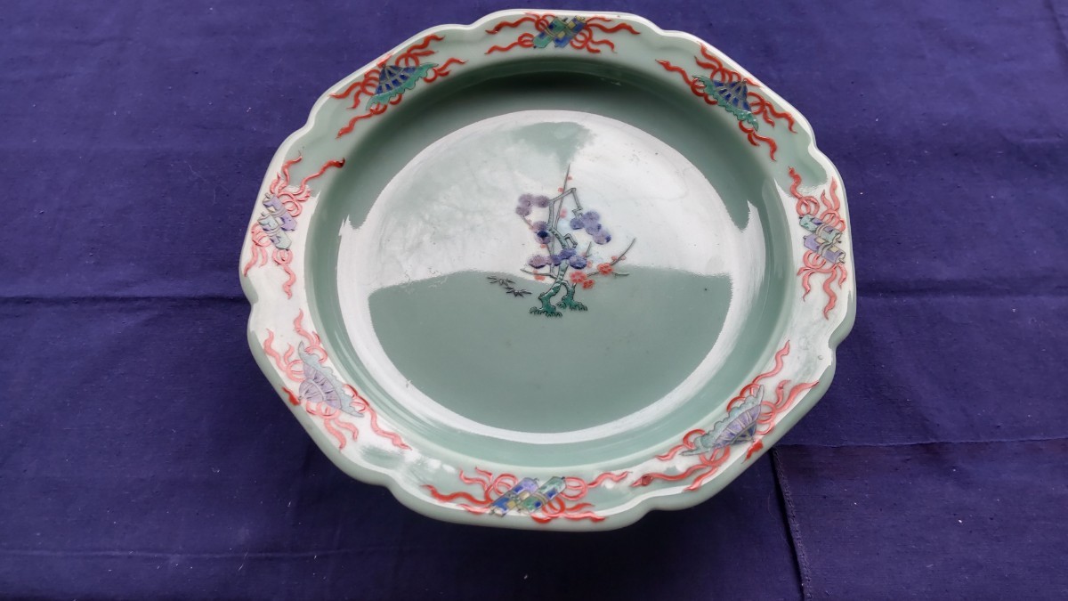 - オールド香蘭社 青磁ミツ足菓子器 松竹梅見込みに陣笠巻物文 推定明治後期